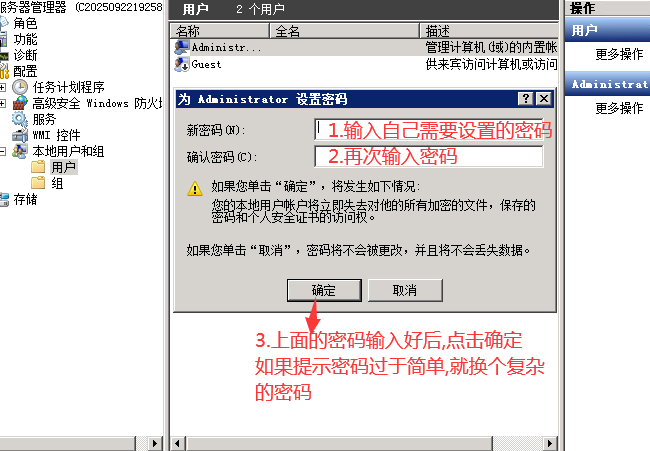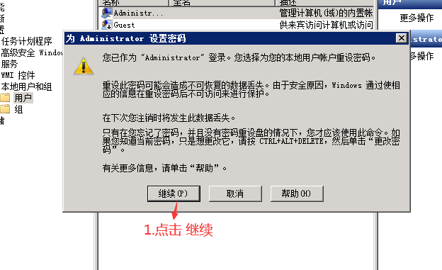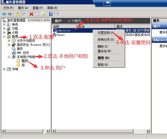 2.在弹出的窗口 双击 配置 - 然后双击 本地用户名和组 - 然后单击 用户 - 然后右击 administrator -然后点击设置密码(注意:如果是win7/win10系统直接从双击 本地用户和组开始)
